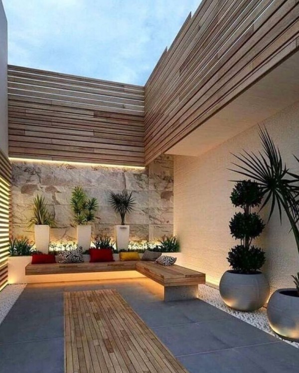 The enclosed courtyard is nicely finished with stylish tall plants.