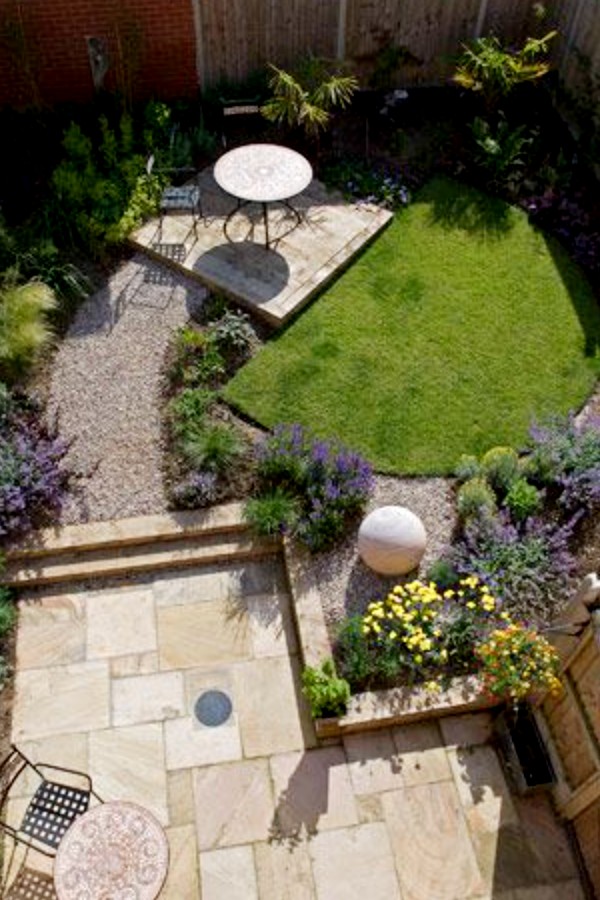 The space in this garden is cleverly used by creating three small lawns instead of one large square one.
