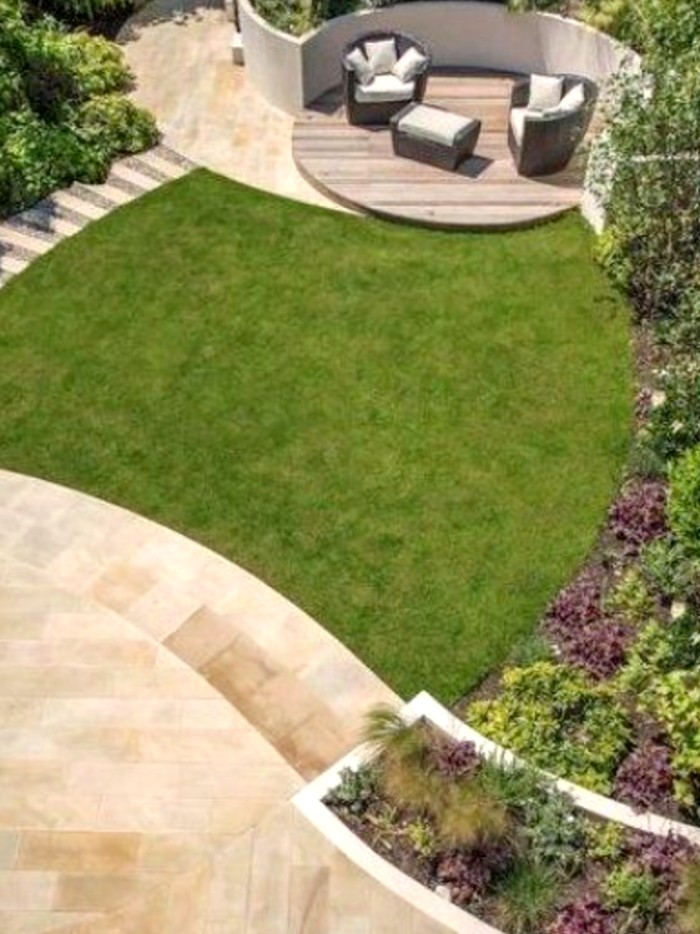 The paths curve nicely around the lawn and enough area is created for plants and flowers. By keeping the colours down, the garden looks organised and neat.